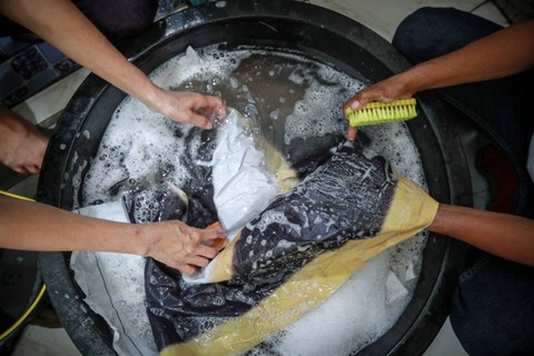 Baliho yang terkumpul itu di potong sesuai ukuran, dicuci dan dijemur sebelum akhirnya dijahit menjadi tas.