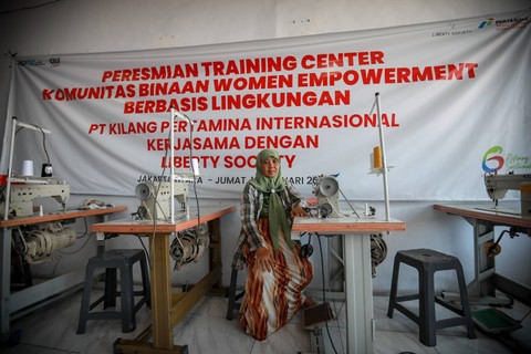 Kesibukan sejumlah perempuan di Training Center Liberty Society di Tanjung Priok, Jakarta Utara, Kamis (21/3). Mereka merupakan warga lokal yang tinggal di daerah Warakas, Tanjung Priok.