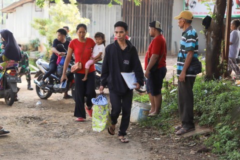 Sejumlah warga dari Kampung Parung Pinang membawa barang bawaan untuk diungsikan sementara karena lokasi mereka berdekatan dengan lokasi kebakaran Gudang Amunisi Daerah, Ciangsana, Bogor, Jawa Barat, Minggu (31/3). Foto: Iqbal Firdaus/kumparan