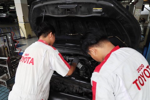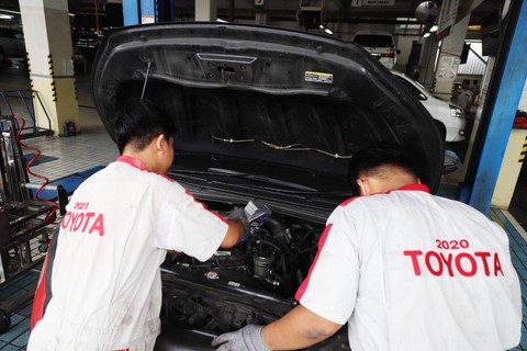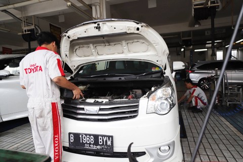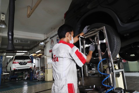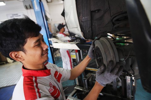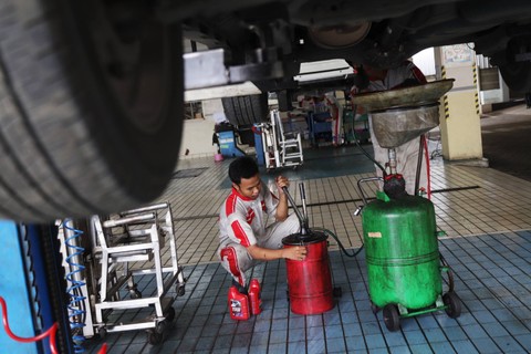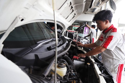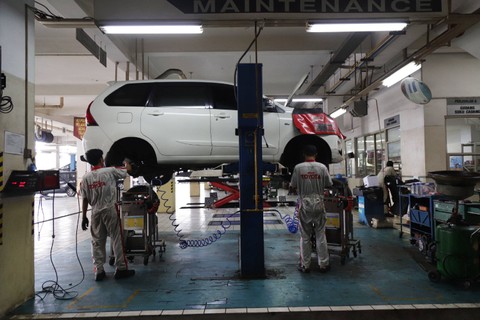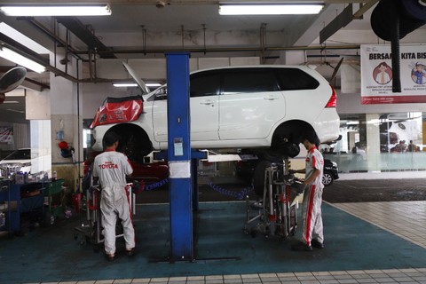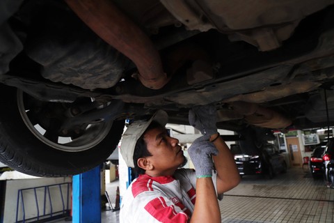Montir memeriksa kondisi mobil di bengkel Auto2000 Permata Hijau, Kebayoran Lama, Jakarta Selatan.