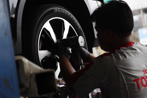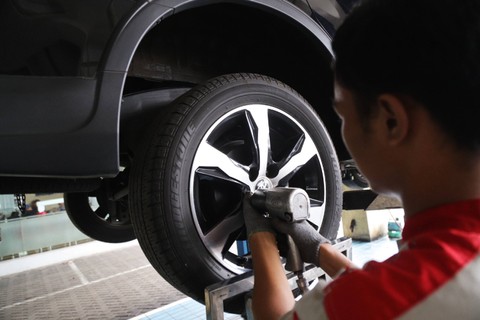 Montir mengangkat ban mobil di bengkel Auto2000 Permata Hijau, Kebayoran Lama, Jakarta Selatan, Selasa (2/4/2024). Foto: Jamal Ramadhan/kumparan