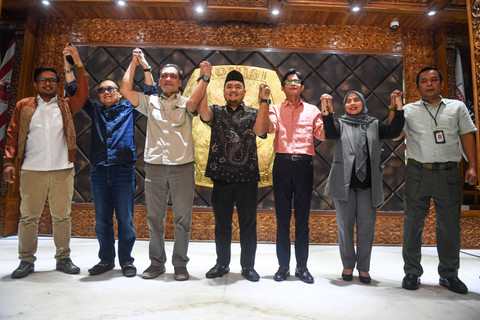 Plt Ketua KPU Mochammad Afifuddin (tengah) bersama (dari kiri-kanan) Anggota Komisioner KPU Idham Holik, Parsadaan Harahap, Yulianto Sudrajat, Agus Mellaz, Betty Epsilon, dan Sekjen KPU Bernard Dermawan Sutrisno mengangkat tangan bersama usai konferensi pers terkait pemilihan petugas pelaksana Ketua KPU di Kantor KPU, Jakarta Pusat, Kamis (4/7). Foto: Muhammad Adimaja/ANTARA FOTOKomisioner KPU Mochammad Afifuddin resmi ditunjuk oleh Komisi Pemilihan Umum (KPU) sebagai pelaksana tugas (Plt) Ketua KPU menggantikan Hasyim Asy'ari yang dipecat oleh Dewan Kehormatan Penyelenggara Pemilu (DKPP) karena terlibat kasus tindakan asusila. Foto: Muhammad Adimaja/ANTARA FOTOFoto: Muhammad Adimaja/ANTARA FOTOFoto: Muhammad Adimaja/ANTARA FOTO