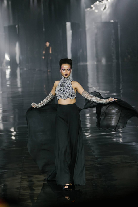 Satu koleksi yang mencuri perhatian kumparanWOMAN adalah jumpsuit hitam dengan aksen lengan ruffle, kerah nan dramatis, dan potongan celana model flare. Jumpsuit ini memberikan kesan tegas sekaligus glamor berkat detailnya yang dipenuhi dengan kristal.