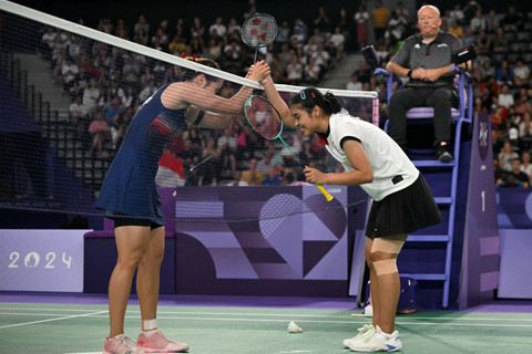 Gregoria Mariska Tunjung berjabat tangan dengan Ratchanok Intanon asal Thailand dalam partai perempat final tunggal putri bulu tangkis Olimpiade Paris 2024 di Porte de la Chapelle Arena, Prancis, pada Sabtu (3/8/2024). Foto: Luis Tato/AFPPebulu tangkis putri asal Wonogiri tersebut berhasil menang dengan dua gim langsung yakni 25-23 dan 21-9. Dengan kemenangan tersebut Gregoria mengamankan tiket semifinal Olimpiade 2024 sekaligus satu satunya atlet bulu tangkis Indonesia yang masi bertahan dalam perlombaan olahraga empat tahunan itu. Foto: ANTONIN THUILLIER / AFPPada pertandingan semifinal nanti Greogria Mariska Tunjung akan menghadapi pebulu tangkis nomor satu dunia yaitu An Se-young asal Korea Selatan yang sebelumnya berhasil mengalahkan Akane Yamaguchi asal Jepang. Foto: Wahyu Putro A/ANTARA FOTOFoto: Wahyu Putro A/ANTARA FOTOFoto: Arun SANKAR/AFPFoto: Luis Tato/AFPFoto: Wahyu Putro A/ANTARA FOTO