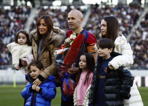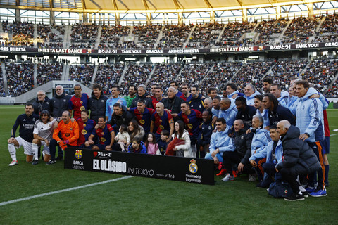 Andres Iniesta dari FC Barcelona Legends berpose pada foto bersama dalam upacara perpisahannya setelah pertandingan FC Barcelona Legends vs Real Madrid Legends di Stadion Ajinomoto, Tokyo, Jepang, Minggu (15/12).