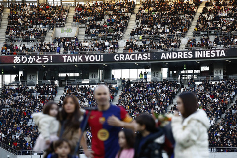Andres Iniesta dari FC Barcelona Legends dalam upacara perpisahan setelah pertandingan FC Barcelona Legends vs Real Madrid Legends di Stadion Ajinomoto, Tokyo, Jepang, Minggu (15/12/2024). Foto: Issei Kato/REUTERS