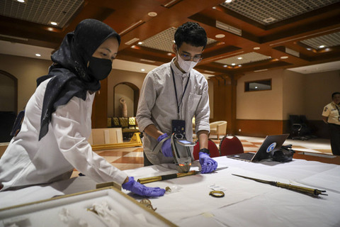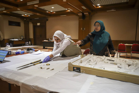 Konservator museum memeriksa benda cagar budaya yang dipulangkan dari Belanda ke Indonesia di Museum Nasional, Jakarta, Senin (16/12/2024). Foto: Iqbal Firdaus/kumparan