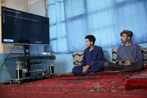 Sejumlah pria di Kabul mencoba menghubungkan TV pintar mereka ke internet di dalam rumah di tengah pemutusan telekomunikasi di seluruh Afghanistan, Selasa (30/9/2025).