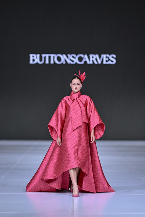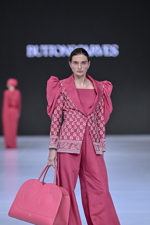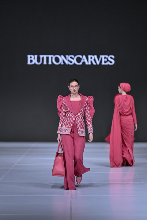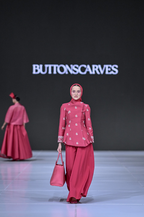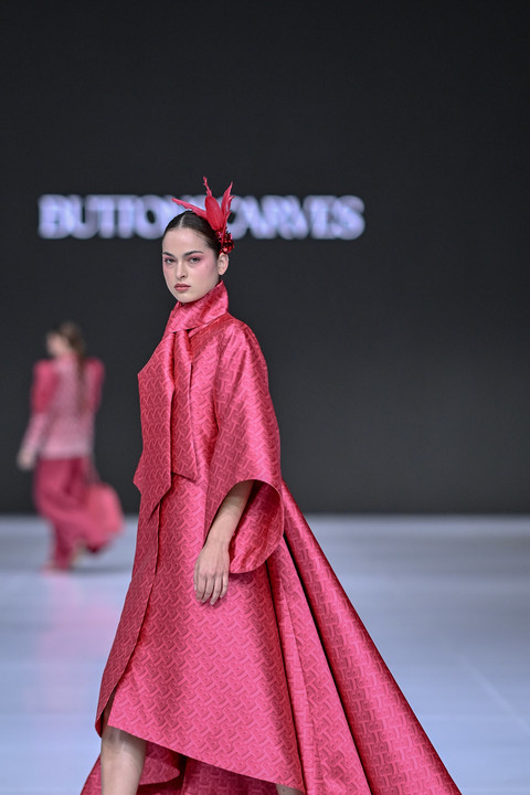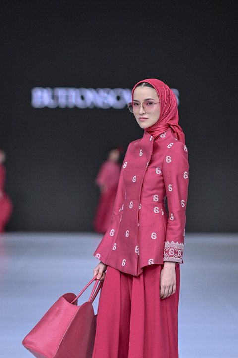 Koleksi Buttonscarves dengan warna viva magenta di show "Jakarta Via Paris" di Jakarta Fashion Week pada Jumat (31/10/2025). Foto: JFW