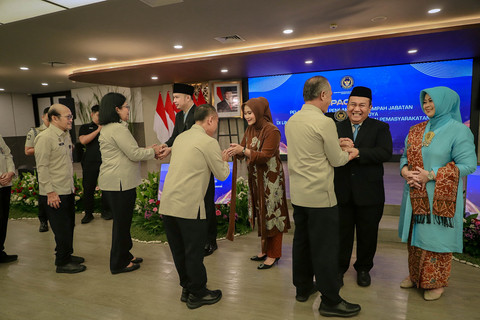 Sejumlah staf Kementerian Imipas tampak memberikan ucapan selamat dengan berjabat tangan usai prosesi pelantikan berlangsung.