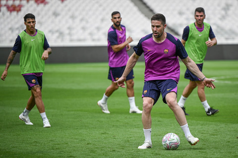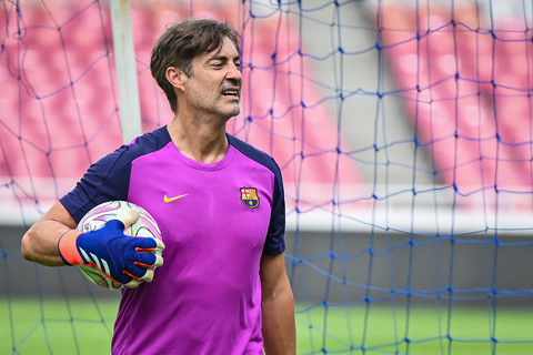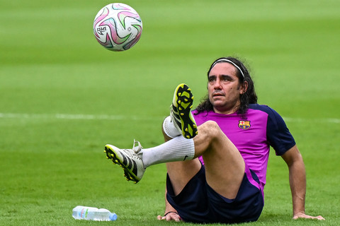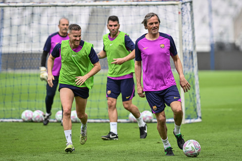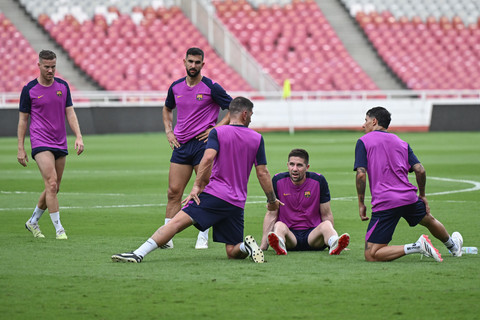 Sejumlah pesepak bola Barcelona Legends mengikuti sesi latihan jelang pertandingan Clash of Legends di Stadion Utama Gelora Bung Karno, Senayan, Jakarta, Jumat (17/4/2026).
