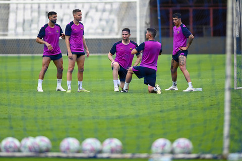 Pesepak bola Barcelona Legends Sergi Barjuan (kanan), Martin Montoya (tengah) dan Cristian Tello (kiri) mengikuti sesi latihan jelang pertandingan Clash of Legends di Stadion Utama Gelora Bung Karno, Senayan, Jakarta, Jumat (17/4/2026). Foto: Fauzan/ANTARA FOTO